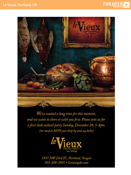 Have you been to Le Vieux in NW Portland yet? Well, why the heck not? It's fantastic. And we're not just saying that because we created the logo, menu, website, and a bunch of other pretty pictures for the joint. The food is really, really good. That's why you should go. Now, here are some of those pretty pictures.